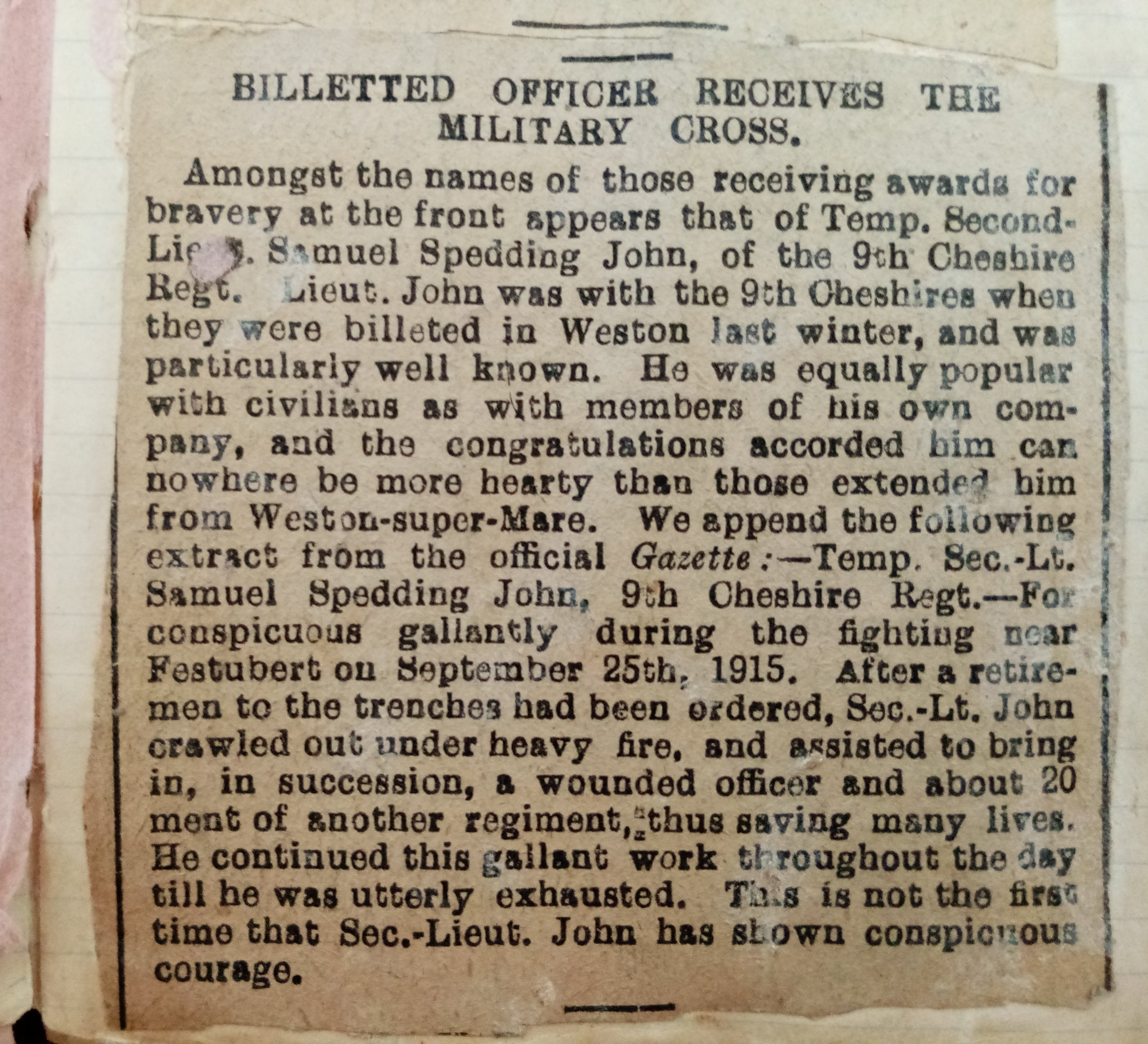 Amongst the names of those receiving awards for bravery at the front appears that of Temp. Second-Lieut. Samuel Spedding John, of the 9th Cheshires Regt. Lieut. John was with the 9th Cheshires when they were billetted in Weston last winter, and was particularly well know. He was equally popular with civilians as with members of his own company, and the congratulations accorded him can nowhere be more hearty than those extended from Weston-super-Mare. We append the following extract from the official Gazette:
