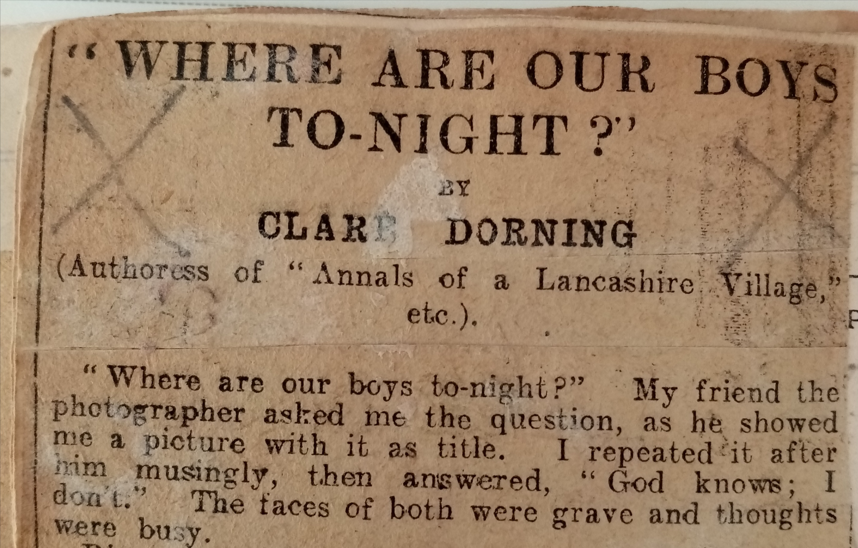 Ah, where are our boys to-night? Some are missing, some wounded, some utterly broken; some we thought lost we shall hear of and see again,the cemeteries and white crosses scattered world-wide answer for others. French friends of my own are scattering flowers over mounds under which lie “nos bons amis les soldat anglaises,” who fought and bled for “La Belle France,” as well as for England’s honour.