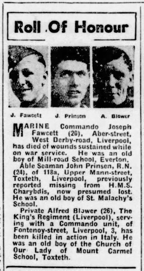 In January 1942, at the age of 21, John married Catherine Wilcott, 20, also from the Toxteth area. The couple had one child together, a daughter also named Catherine, who was born on 16th December 1942. An edition of the Liverpool Evening Express, published in December 1944, lists John’s address as having been 118a Upper-Mann Street, Toxteth, and states he had been a pupil at St Malachy’s school.
