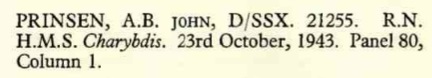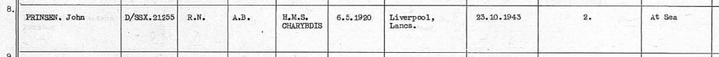 John Prinsen was among the 464 crew members who lost their lives during the sinking of Charybdis. His body was never recovered, and he is commemorated on the Plymouth Naval Memorial.